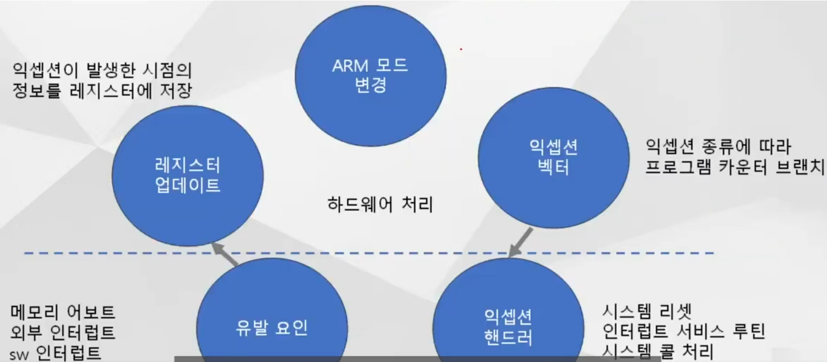 - 예를 들어 SVC 명령어를 실행하면 익셉션이 유발, 유저모드 -> 커널모드로 바뀜